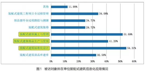 清華大學(xué)土木工程系教授、博士生導(dǎo)師 馬智亮 隨著國家產(chǎn)業(yè)結(jié)構(gòu)調(diào)整和建筑行業(yè)對綠色節(jié)能建筑理念的倡導(dǎo),裝配式建筑受到越來越多的關(guān)注。眾所周知,裝配式建筑具有減少環(huán)境污染、縮短工期、提高建造質(zhì)量等優(yōu)點。2016年9月,國務(wù)院辦公廳發(fā)布《關(guān)于大力發(fā)展裝配式建筑的指導(dǎo)意見》,提出“力爭用10年左右的時間,使裝配式建筑占新建建筑面積的比例達到30%?!鼻靶┠晡覀冎v信息化,現(xiàn)在講數(shù)字化,那么,未來就是智能化,即智慧建造。裝配式建筑最有條件率先走向智慧建造。下面,將從裝配式建筑智慧建造目前的應(yīng)用現(xiàn)狀、應(yīng)用系統(tǒng)的發(fā)展及發(fā)展趨勢3方面,來作一闡述。 為了了解裝配式建筑智慧建造的現(xiàn)狀,我們委托專業(yè)調(diào)研公司由PC端、手機微信端和郵箱進行調(diào)查問卷鏈接推送,共收到267份問卷。被訪對象單位類型包括政府部門、建設(shè)開發(fā)單位、勘察設(shè)計單位、科研單位等,被訪對象來自華北、華東、華南、華中等全國多個地區(qū)。調(diào)查結(jié)果顯示,在裝配式建筑信息化應(yīng)用情況中,裝配式建筑標準化設(shè)計、裝配式建筑施工與管理、裝配式建筑部品生產(chǎn)與管理應(yīng)用比例靠前,如圖1所示。