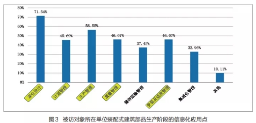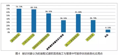 在現(xiàn)場施工與管理階段,裝配式建筑的信息化應(yīng)用還比較滯后,調(diào)查數(shù)據(jù)顯示,虛擬預(yù)拼裝、可視化技術(shù)交底、預(yù)制部件質(zhì)量跟蹤管理等占比較高,如圖4所示。