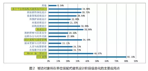 在設(shè)計階段,應(yīng)用BIM技術(shù)進行裝配式建筑設(shè)計建模是最主要的應(yīng)用點,應(yīng)用最多、占比最高。其次是二維CAD施工圖設(shè)計、集成設(shè)計、基于平臺的裝配式建筑的協(xié)同設(shè)計等,如圖2所示。