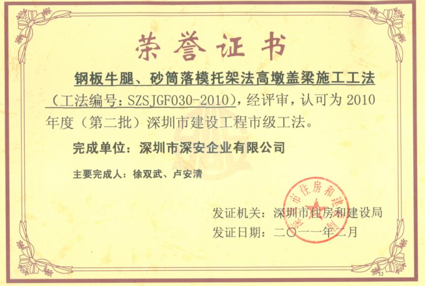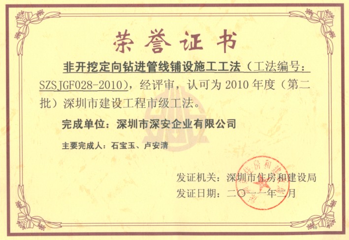 由深安企業(yè)申報(bào)的《非開挖定向鉆進(jìn)管線鋪設(shè)施工工法》、《鋼板牛腿、砂筒落模托架法高墩蓋梁施工工法》最近被深圳市住房和建設(shè)局批準(zhǔn)為深圳市市級工法,填補(bǔ)了深安企業(yè)在建筑業(yè)施工市級工法上的空白,實(shí)現(xiàn)了歷史性的突破。