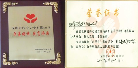 多年來,深安企業(yè)始終堅(jiān)持中華民族扶貧濟(jì)困的優(yōu)良傳統(tǒng),在企業(yè)逐步發(fā)展的同時(shí),始終不忘自身承擔(dān)的社會(huì)責(zé)任,在社會(huì)各類救助活動(dòng)中,關(guān)心災(zāi)區(qū)群眾,主動(dòng)伸出援助之手實(shí)施救助,自愿為社會(huì)捐款捐物,為深圳的慈善事業(yè)中做出了積極貢獻(xiàn)。
