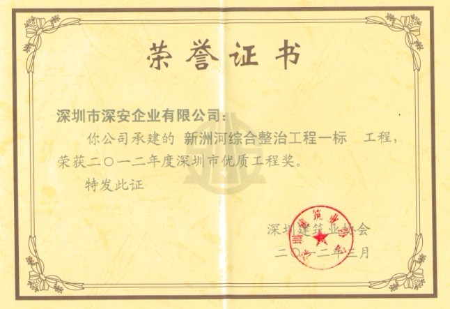 由深安企業(yè)施工總承包的“新洲河綜合整治工程一標(biāo)”工程,最近被深圳建筑業(yè)協(xié)會(huì)評(píng)為2012年度深圳市優(yōu)質(zhì)工程獎(jiǎng)。