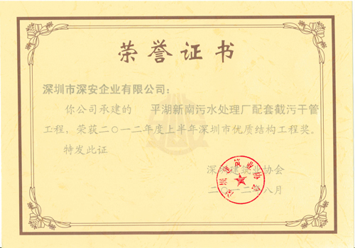 2012年8月10日,深圳建筑業(yè)協會發(fā)布了《關于表彰2012年度上半年深圳市優(yōu)質結構工程獎的決定》,通過專家對企業(yè)申報項目的檢查及驗收、經深圳建筑業(yè)協會工程質量工作委員會審定,深安企業(yè)施工承建的平湖新南污水處理廠配套截污干管工程,獲“2012年度上半年深圳市優(yōu)質結構工程獎”。
